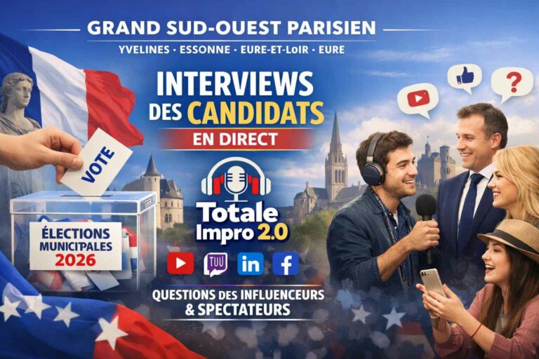 Je te remercie pour ta prise de contact et l’intérêt que tu portes à la chaîne de streaming en direct « Totale Impro 2.0 », média frontière du grand sud-ouest parisien (78, 91, 28 & 27). Faute de temps, je ne suis plus en mesure de répondre à tous les messages que je reçois ou les sollicitations pour être invité.
