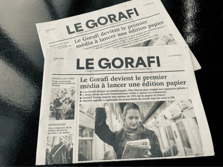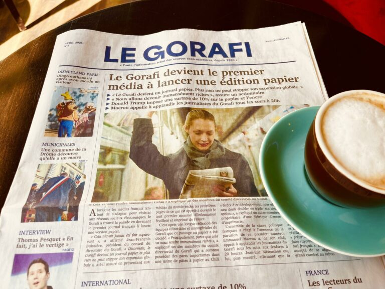 ▪️ Ce matin-là, je n’arrivais pas les mains vides. Dans mes bras, le premier numéro papier du Gorafi, ce pure player satirique né sur internet, donné jusqu’ici gratuitement en version numérique et désormais affiché à 7 euros en kiosque. L’objet a circulé de main en main avec une fluidité déconcertante. Avant même que j’aie eu le temps de le poser sur le zinc, un client à l’autre bout de la salle en lisait déjà un, religieusement, comme s’il s’agissait du Monde diplomatique. L’invasion avait pris de l’avance sur moi.